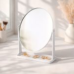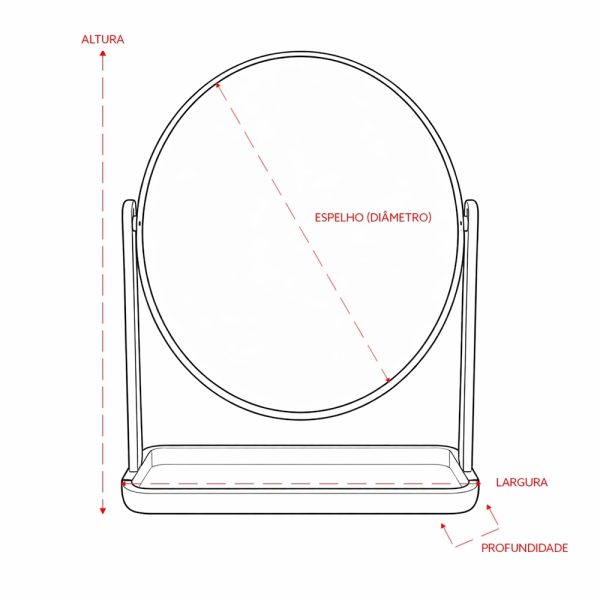 Espelho de mesa giratório sem aumento em formato oval, com estrutura em plástico e base com espaço para organizar pequenos objetos.