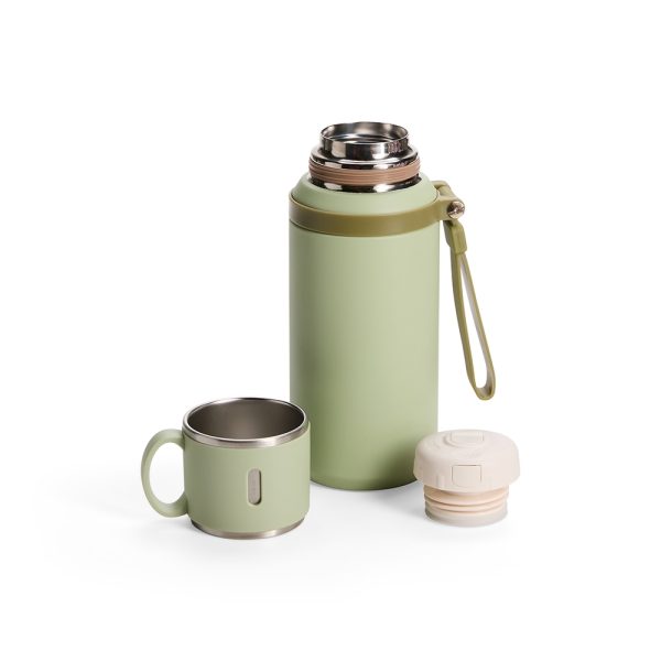 Garrafa térmica em inox com pintura eletrostática e capacidade de até 600ml. Possui estrutura de parede dupla e tampa interna rosqueável com anel de vedação, abertura do bocal por botão de acionamento e infusor. Conta ainda com tampa externa em formato de caneca e alça emborrachada para transporte.
